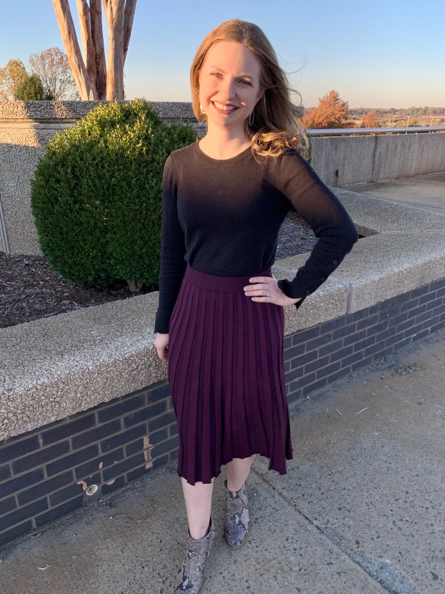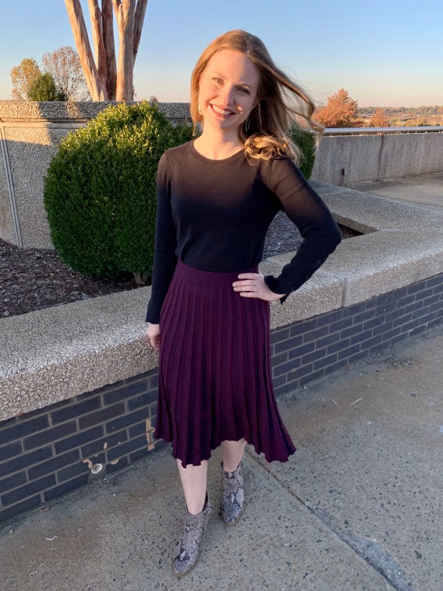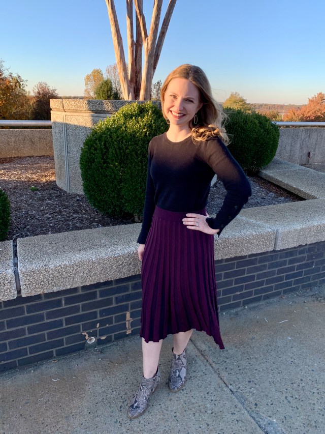 Fortunately, this day was absolutely gorgeous with 50 degree weather, so no tights needed! This sweater has a nice little detail with the button cuffs, but sadly is old from Loft so no longer available. I’ll see if I can find anything similar to link. The sweater skirt and booties are both recent purchases from Target when they were having Target Circle sales, and I love them! The skirt is just so fun and feminine and very high quality! I can’t wait to find different ways to style it. The booties are a great, budget-friendly way to get in on the incredibly popular snakeskin trend, and I’ve been surprised just how many outfits they go with! They are actually incredibly versatile! While they are comfortable for running errands or light everyday wear, I wouldn’t wear them for heavy sightseeing or shopping days when you’re going to be racking up a lot of steps. They are a great value and wardrobe addition, though!